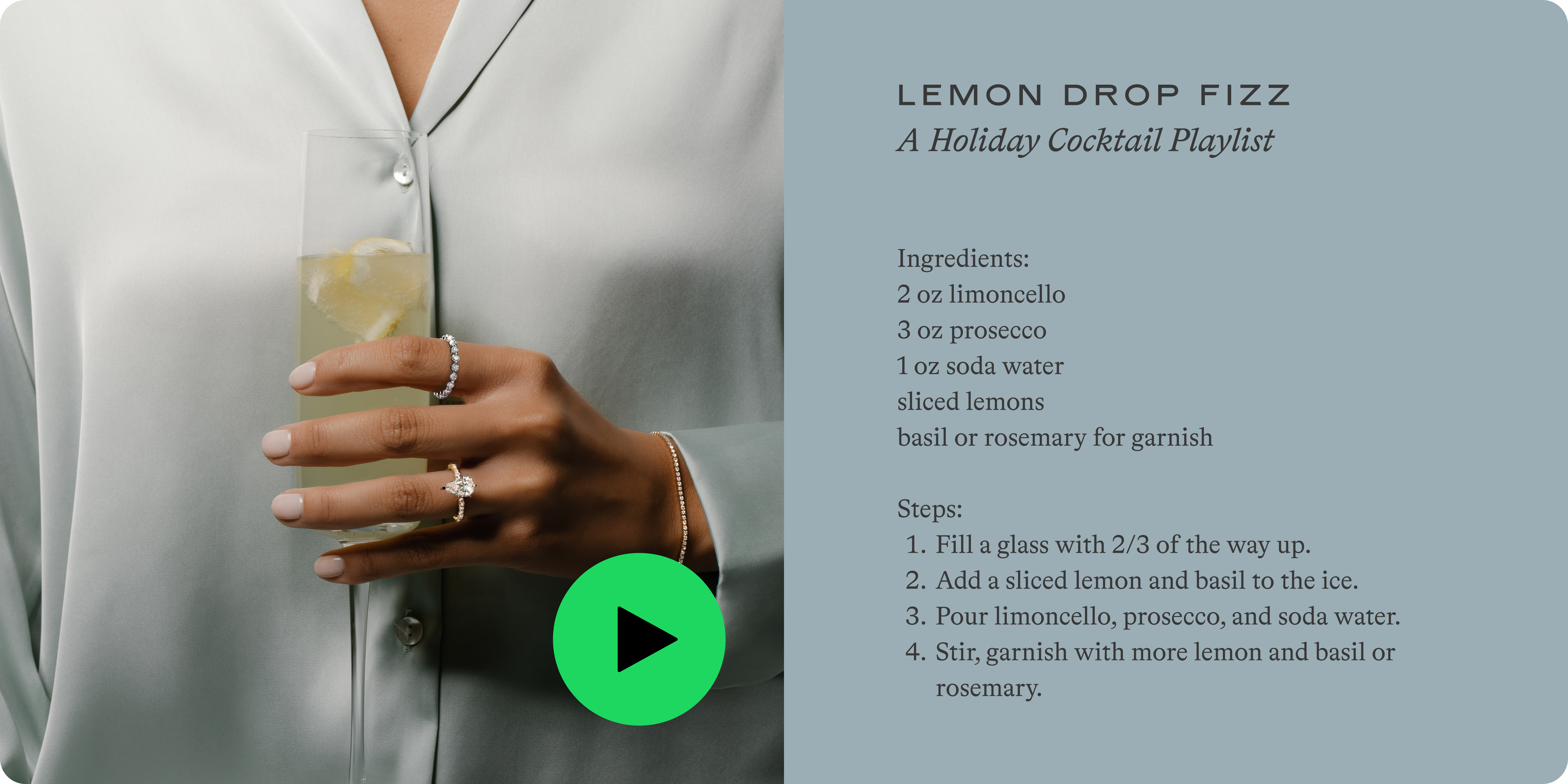 Each Clean Origin spotify playlists (with specific cocktail recipes as titles and info) have their own personalities, just like each of our engagement rings.